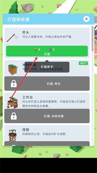 2、根据资源数量(如木材、石头)打造工具(如斧头),斧头可用于收集木材,升级后能增加木材产量。