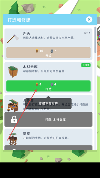 3、收集足够资源后,打造基础设施(如木材仓库),木材仓库可存储木材,升级后增加容量。