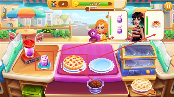 2、观察顾客对应的餐品需求,将制作完成的餐品交付给对应顾客,完成订单以推进关卡进度。