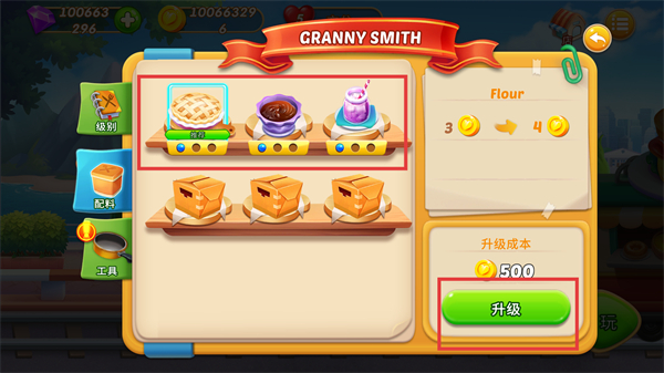 4、进入【配料】界面,可以对餐品进行等级升级,消耗金币点击【升级】按钮,提升该配料的等级。