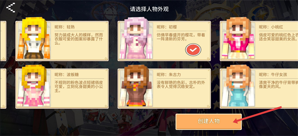 2、挑选人物外观时,可在【初樱】等多个风格中选心仪的,确定后点击【创建人物】。