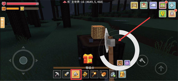 1、进入游戏后,用【斧头】砍伐木头,收集基础资源,这是建造家园和制作物品的第一步。