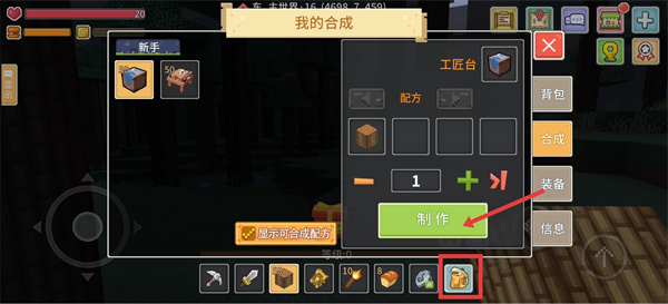 2、打开合成界面,放入木头,点击【制作】按钮就能合成【工匠台】,开启更多物品制作的可能。