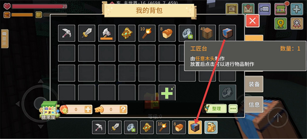 4、把快捷栏中的【工匠台】放置到地面,点击它即可使用,后续可在上面制作更多道具,助力冒险与建造。