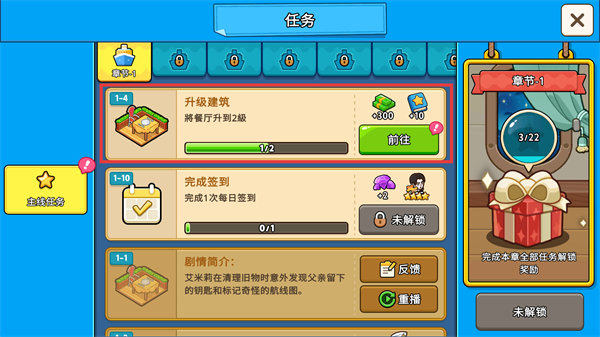 4、确认餐厅升级任务完成,界面显示【完成】状态,可领对应奖励继续推进主线任务。
