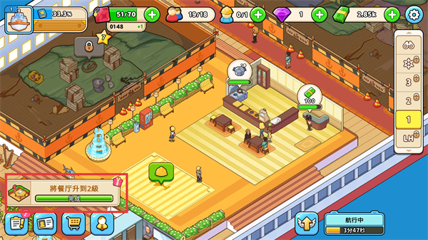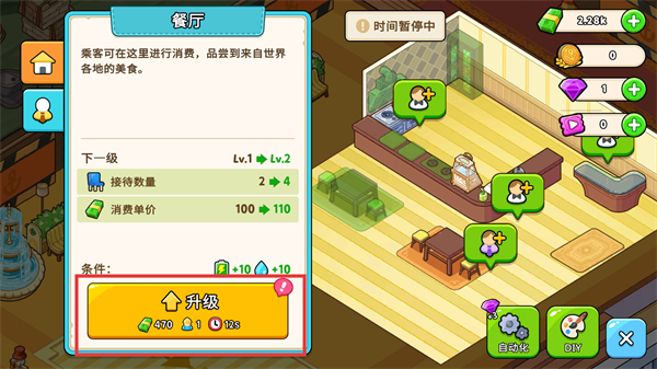 3、打开餐厅升级界面,消耗【470】金币和【1】蓝色物品,等【12】秒完成升级提升接待力。