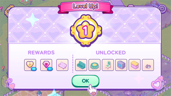 3、等级提升至1级后,点击【OK】按钮领取奖励,同时解锁新装饰道具。