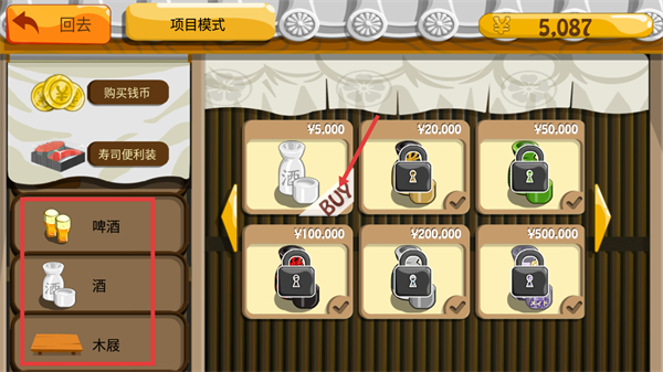 2、进入【项目模式】界面,选择【酒】类选项,找到【白色酒杯】对应的【BUY】按钮,准备消耗钱币购买。