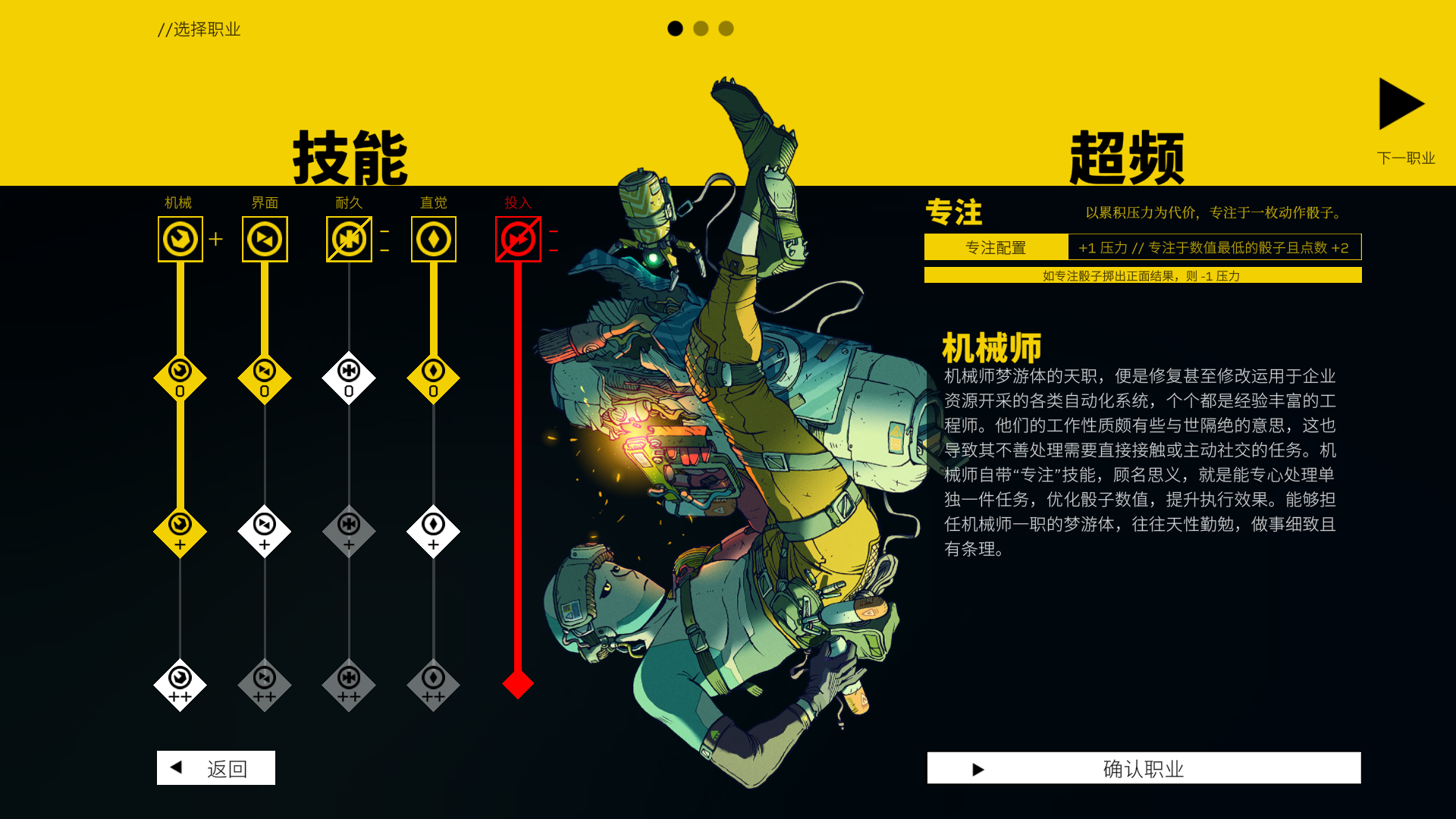 2、玩家可以选择三种职业,分别是,侧重机械的机械师,侧重界面的操作员,侧重耐久的采矿工。