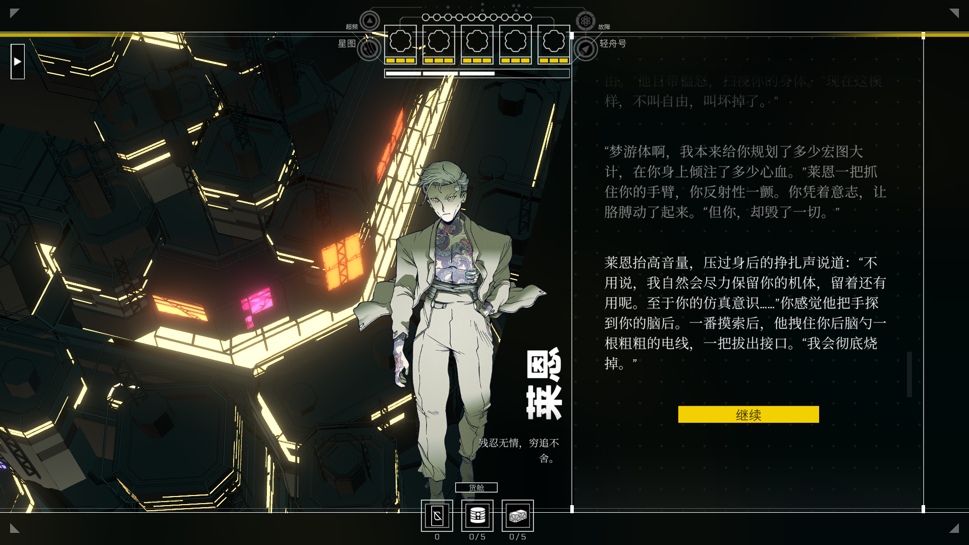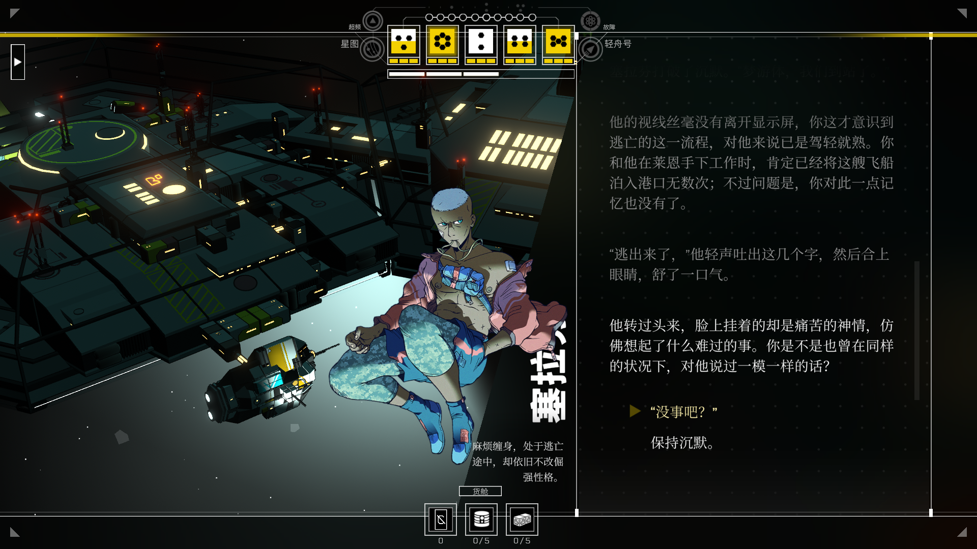 3、游戏开始,玩家需要偷取飞船随后逃离此地,主要通过剧情对话来推动剧情的发展。