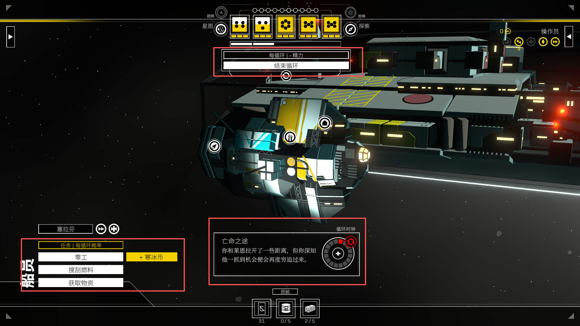 5、玩家可以通过点击左下角的“零工”,“搜刮燃料”等选项来获取,货币,燃料以及零件等等,点击屏幕上方的“结束循环”,会进入下一回合,下方的敌人就会距离玩家更近一步。