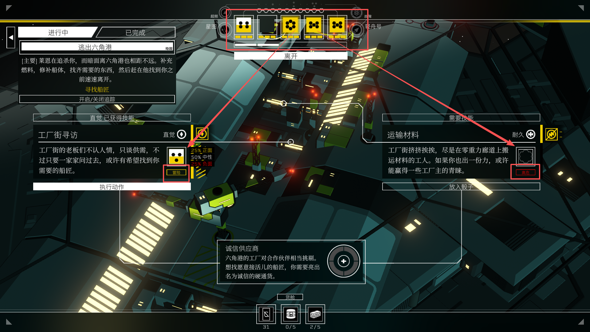 6、随后就是骰子机制,玩家需要将屏幕上方的投掷放置在相应事件的凹槽,随后点击相应行动的“执行动作”,事件会根据骰子的大小来判断,安全,冒险,高危的概率,玩家需要慎重选择,也要充分利用自己职业特性的能力,扭转局势。