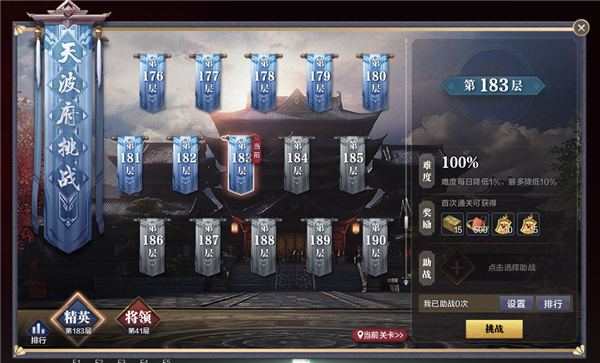 天波府的试炼挑战分为了精英和将领。关于关卡内的内容让我们稍后细说,先来看看关于天波府界面的其他内容。