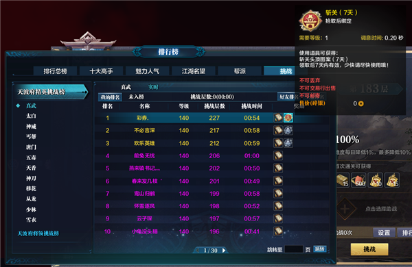 天波府有排行奖励,依据通关层数高低以及通关时间的长短依次排序,通关层数越高且时间越短的少侠排名会更靠前,排名在同职业内生成。在周末结算时,排名前十的少侠可以获得称号奖励,前三的少侠可以获得头顶右侧图标奖励。