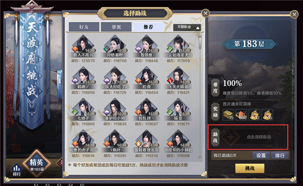 少侠可以在助战位置选择一名同帮派成员或者好友进行助战,被选择为助战的少侠为AI控制,受本身角色属性影响。