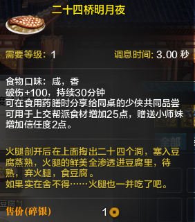 性价比优选是6级火腿蒸豆腐产出的二十四桥明月夜,虽然破伤加成低了一点,但是持续时间要长很多,也便宜。