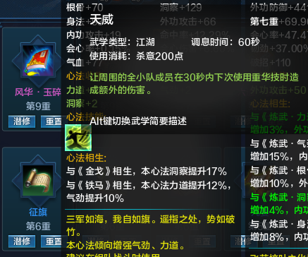 注:如果精英层选丐帮助战,由于丐帮技能特性,小怪会先攻击少侠,少侠可以在这个时候卡低血量吃沉舟被动,此时征旗就不适合替换沉舟,应该替换其它低位心法,不过这样对手法要求高一些,少侠可以自行选择。