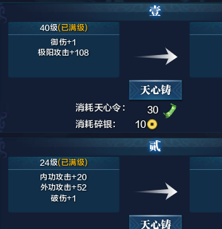 武器和饰品的天心铸第一条一定要洗极阳攻击,第二条优选内外功攻击。
