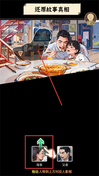 2、在剧情还原环节,将【母亲】头像拖动至对应人物影像框,完成拼图互动以解锁后续故事线。