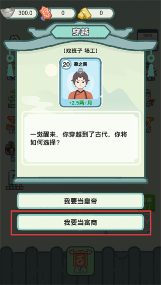2、穿越后在选项界面选择【我要当富商】,确定发展方向,开启对应路线的剧情与资源积累。