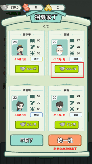 3、在招募家丁页面,消费对应的银两购买家丁。