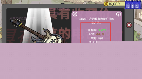 2、查看【电吉他】的详情面板,关注【稀有度-少见的】【状态-不好的】信息,评估其交易价值。