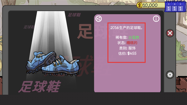 4、查看【足球鞋】的详情,注意【状态-糟糕的】【估价-455】信息,判断是否值得交易。