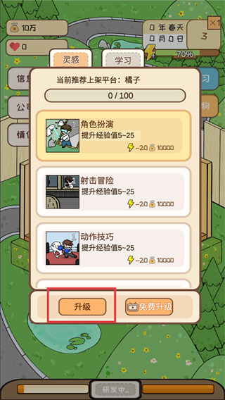 2、在灵感界面选【角色扮演】类型,消耗【20】闪电与【10000】金币升级,推进研发进度。