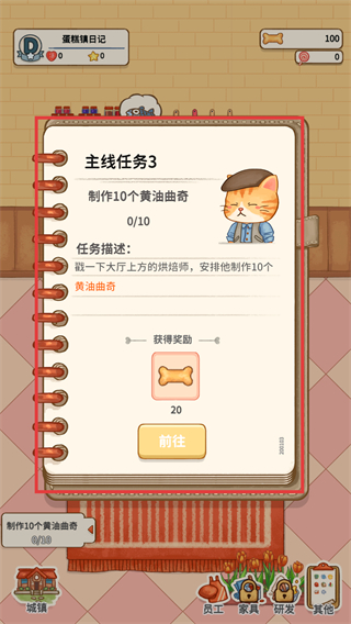 2、主线任务3为制作10个黄油曲奇,点击前往按钮进入制作界面,完成后能获得20骨头奖励。