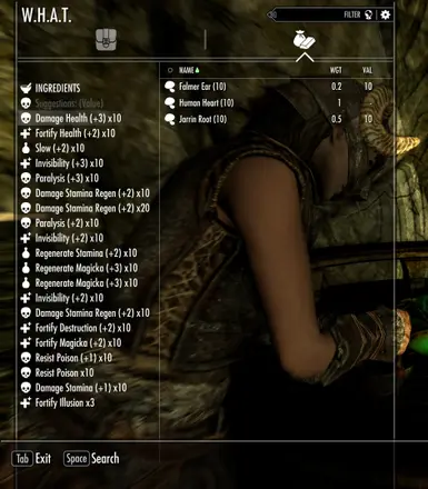 1、它作为SkyUI炼金菜单中的新模式出现。切换到“W.H.A.T.”模式,左侧面板会变成一个精心整理的建议配方列表,而不是已知效果列表(随时切换回去——它的作方式和附魔菜单一样)。
