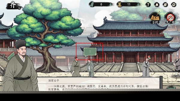1、在【齐】国场景中,点击互动提示按钮,查看法家士子的言论内容,了解对应学派观点。