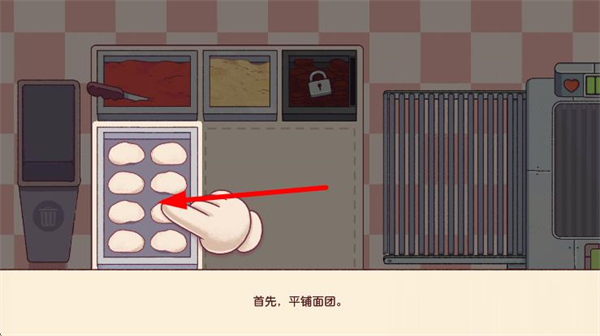 1、进入游戏后,先点击面团取出,将其平铺成披萨饼底。