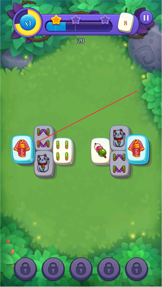 2、持续匹配相同图案的牌如猫咪、糖果,消除后提升分数,推进关卡进度。