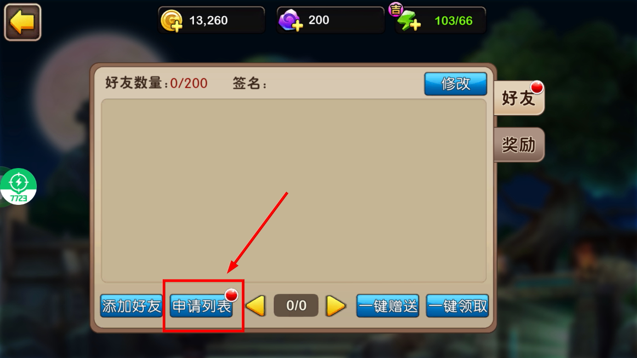 2、进入好友界面后点击下方【申请列表】按钮,可查看其他玩家发送的好友申请信息。