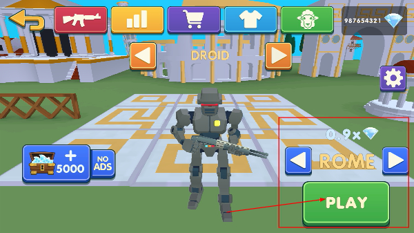 1、点击界面中的【PLAY】按钮,即可进入带有【DROID】-【ROME】标识的游戏准备场景,开启射击防御的挑战。