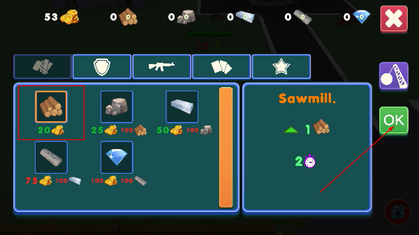 4、在【Sawmill】界面中消耗【20金币】解锁木材生产道具,点击【OK】确认后获取资源,助力提升防御与武器威力。