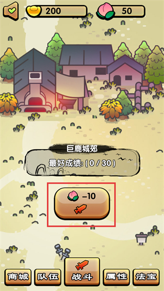 1、进入巨鹿城郊场景后,消耗【桃子-10】获取道具,点击【战斗】按钮开启关卡挑战提升成绩。