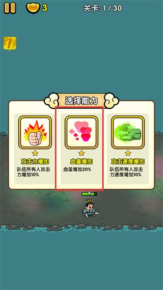 3、完成关卡后出现能力选择界面,优先选【血量增加】提升队伍生存力应对后续挑战。
