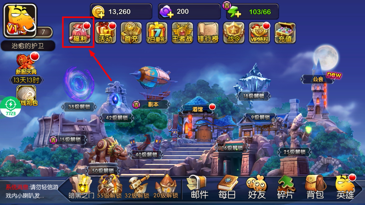 1、主界面点击【福利】按钮,进入福利页面,这是获取初期资源的关键第一步,能解锁多种奖励渠道。