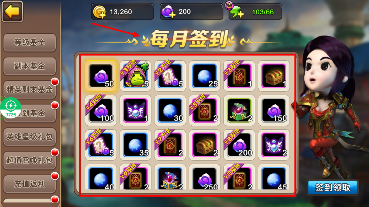 2、进入【每月签到】页面,领取对应天数的奖励,如50符石,积累资源助力前期发展。
