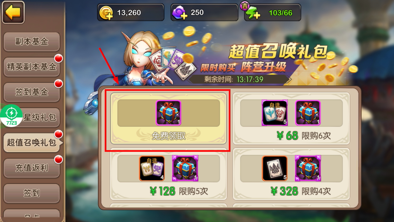 4、在【超值召唤礼包】界面点击免费领取,获取限时福利,提升阵容实力的好机会。
