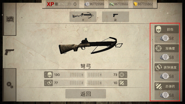 2、进入【升级】界面,消耗货币升级瞄准精度,提升【弩弓】的射击稳定性与命中率。