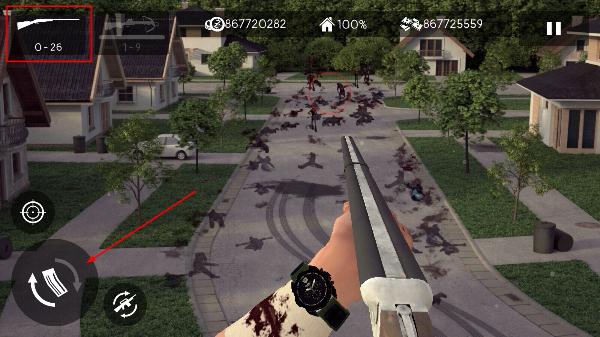 4、当弹药耗尽时,点击【换弹按钮】补充弹药,持续对剩余僵尸目标发起攻击以完成关卡。