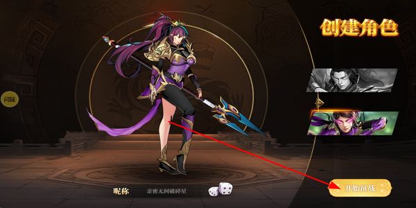 1、玩家在创建角色界面确定昵称,选择对应角色形象后点击开始征战,进入游戏开启冒险旅程。