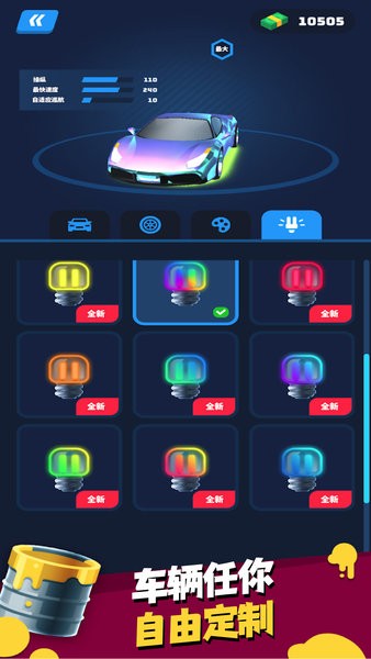 4、赛车皮肤工坊:提供千种涂装组合,支持上传自定义图案打造个性战车。