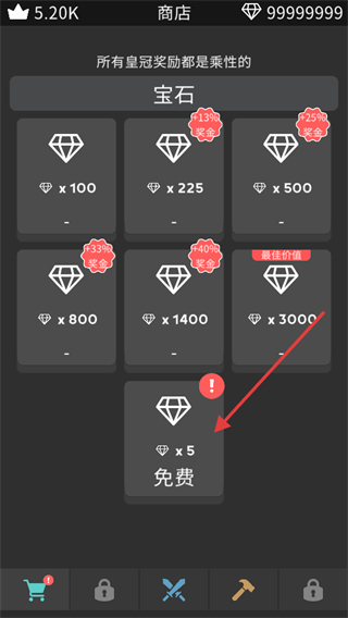 1、在商店界面领取【免费-x5】宝石,也可购买不同数量的宝石。