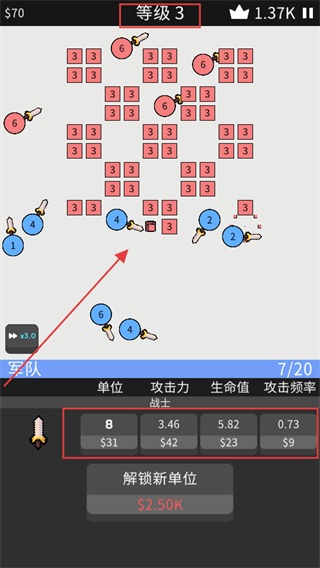 3、等级3战斗时,面对更复杂的敌人分布,利用军队单位属性,优先攻击聚集区域,高效清理战场。