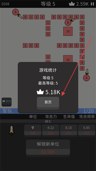 4、达到等级5后,可查看游戏统计,获取皇冠资源,点击【首页】返回主界面。
