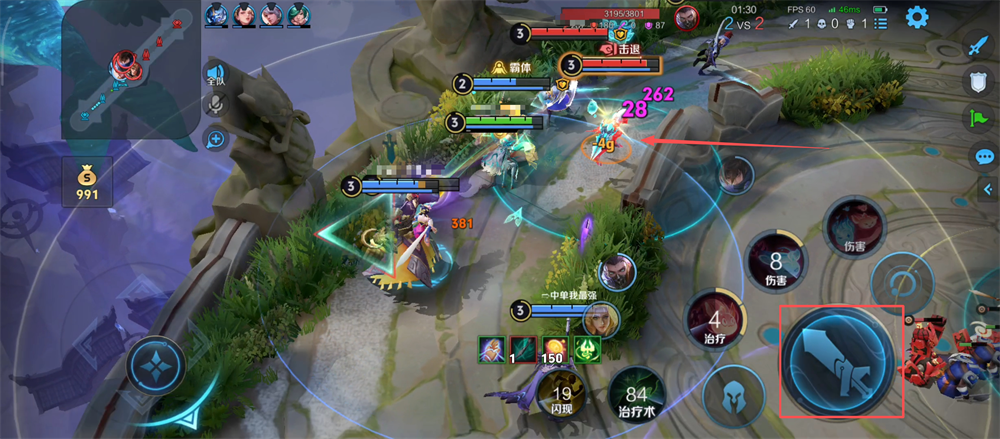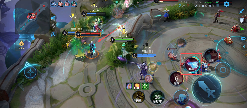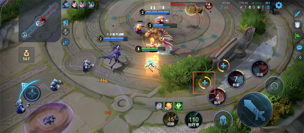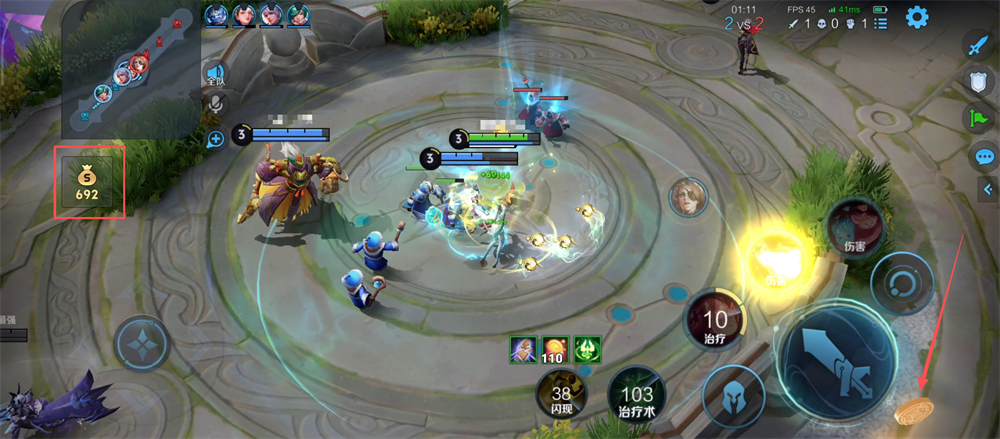 2、注意左边的金币数,拾取地图中的金币,攒够金币购买装备让大招伤害和治疗更给力呢。