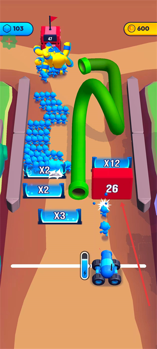 炸弹人冲冲冲是一款极具趣味的休闲小游戏。玩家进入游戏就能掌控着强大的大炮,开启刺激的轰炸之旅。玩家需在有限时间内巧妙操作,力求斩获高分。小兵途径蓝色大门时,人数会瞬间翻倍,实力大增,而经过红色大门,可能遭遇棘手状况,这就要求玩家深思熟虑,精心规划派兵路径,巧妙避开危险,从而成功招募更多小兵,壮大队伍,朝着胜利全力进发。